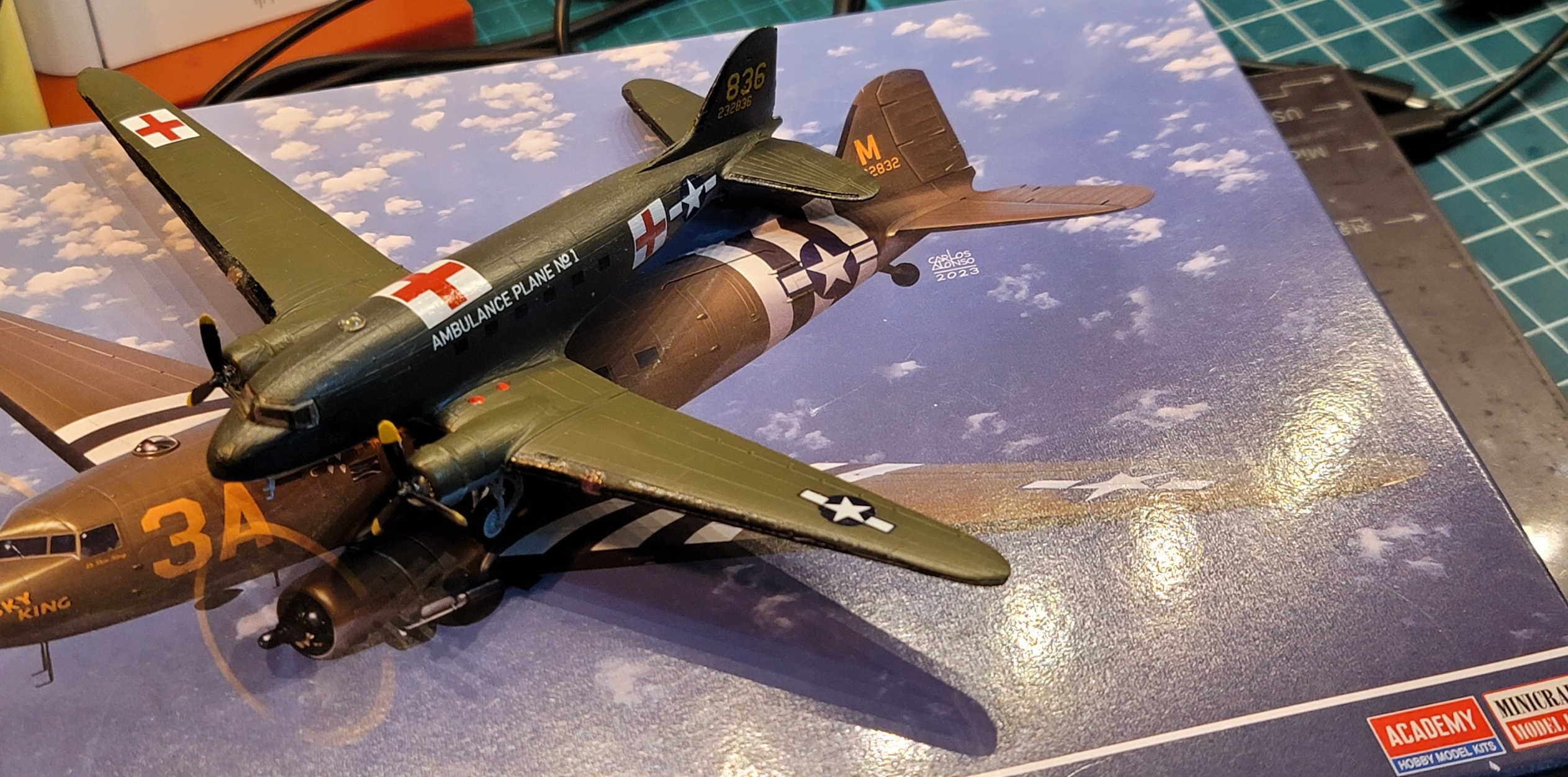 철도모형과 유사 축적 1:144인 2차 세계대전 연합군측 수송기로 유명한 C-47 모형을 구입, 조립 1일, 색칠 1일, 데칼 1일 해서 총 사흘동안 만듦. 미니크래프트라는 회사의 것을 박스갈이해서 파는 것인지는 모르겠으나... 간만에 아카데미 퀄리티 같지 않은, 만들기 쉽지 않은 키트를 구했던 것 같다. 몰드와 설명서가 맞지 않고, 부품에 burr (이바리라고 하는 그것) 가 많음에도 부속이 작아 줄질하기도 힘들고 파트 접합도 잘 안되고 뭔가 비틀어진다. 조립이 힘들다기 보다는 앞뒤로 표면처리하느라 시간을 하루 허비.