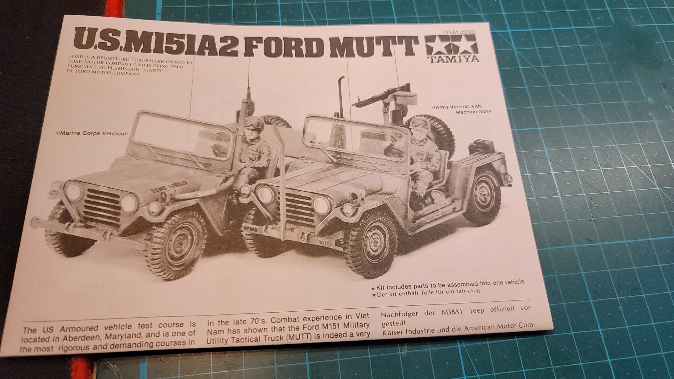 당시엔 관심깊게 보지 않았던 배리에이션인데 이 제품은 육군형, 해병대형 차량 두 가지로 크게 선택 조립할 수 있고, 육군형은 그 유명한 82 공수사단 차량, 미국 애리조나 방위군, 제 3 기갑사단 데칼을 사용할 수 있으며, 미 해병대형은 일본 캠프 후지에 주둔했었던 부대 차량을 재현하고 있다. 82공수 차량으로 만들려다가 옵션이 좀 더 다양해 보이는 해병대형으로 선택하고 조립.
