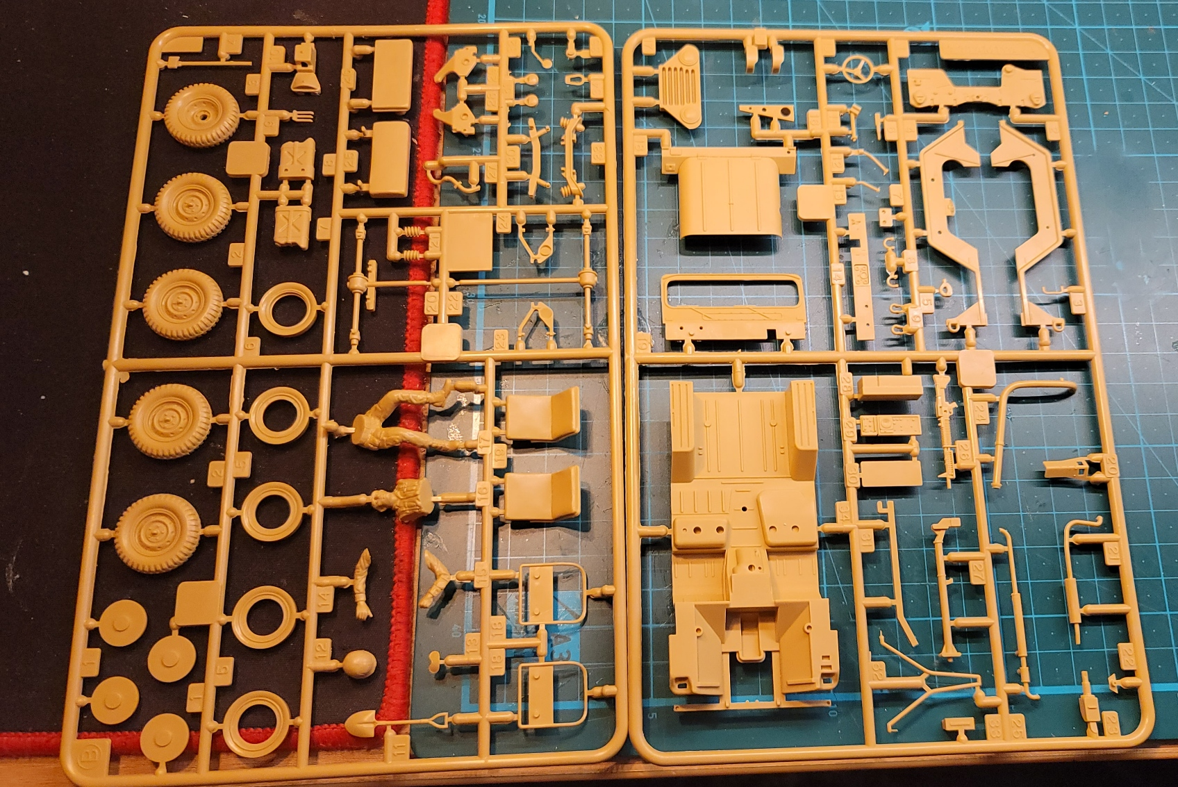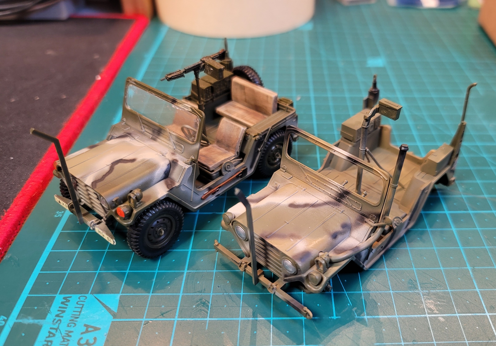 이후에 나머지 타이어나 의자 등의 부품들도 도색하고 부착, 그리고 데칼을 먹임. 데칼이 오래되었는지 타미야 것 답지 않게 자꾸 찢어져서 고생함. 결국 몇 가지는 밀리고 난리 부리는 통에 날려먹고, 일부는 아카데미 M151A2 쪽에 붙여줌. 실력이 좋지는 않지만 차량의 시대배경과 비슷하도록 운전병도 4색 위장색을 아크릴물감으로 조색해서 칠해 주었다. 뒤의 두 명의 인형은 타미야 2차대전 미군 전차병 모형 시리즈에 있던 것을 그냥 어울려 줘 봄. 고증과는 전혀 상관없는 시츄에이션이지만, 확실히 장비에 사람을 붙여 놓으니 아무것도 아님에도 이야기가 있는 것 같이 느껴진다.