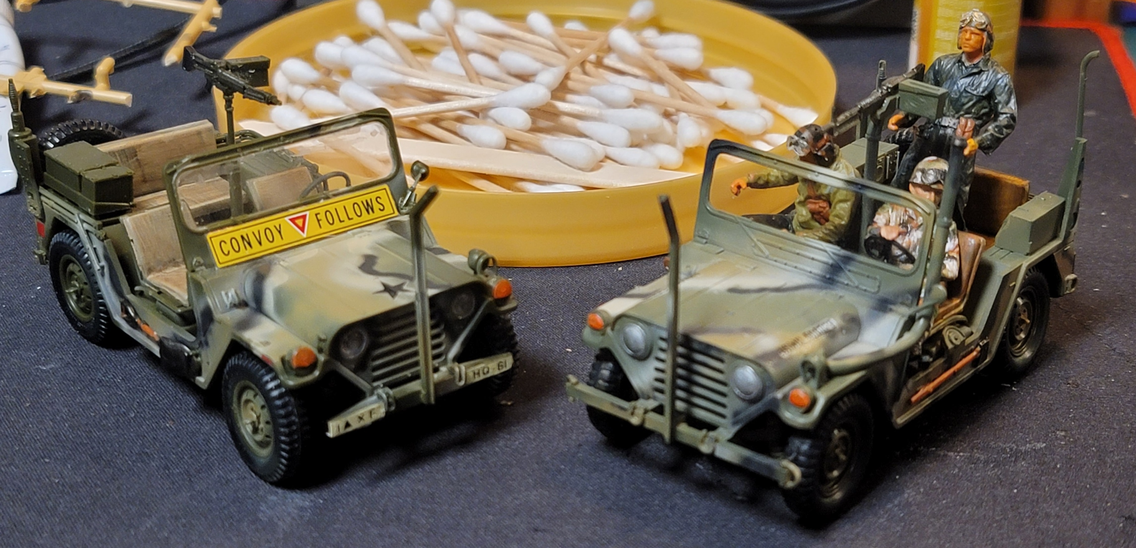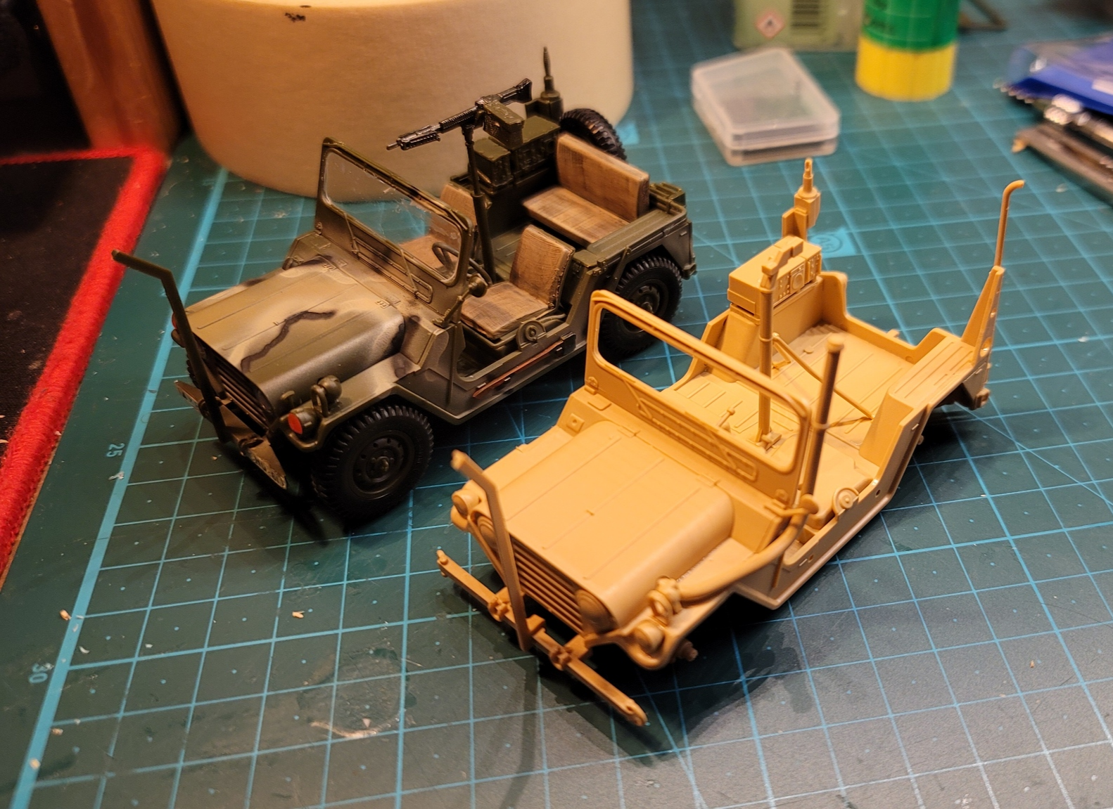 좌측 아카데미 신금형 M151A2, 우측 타미야 M151A2. 보시다시피 같은 색으로 칠해 두니 외관이나 크기나 차이는 없고 - 같은 차량이니 당연하다 할 수 있지만 - 전조등, 방향등에 투명파츠가 있고 타이어도 고무이며, 뒷좌석 무전기 (AN/VRC 47)도 좀 더 진짜 것 같이 생긴 아카데미쪽이 좀 더 전면이 입체적이기는 하지만 멀리서 보면 그놈이 그놈같다.