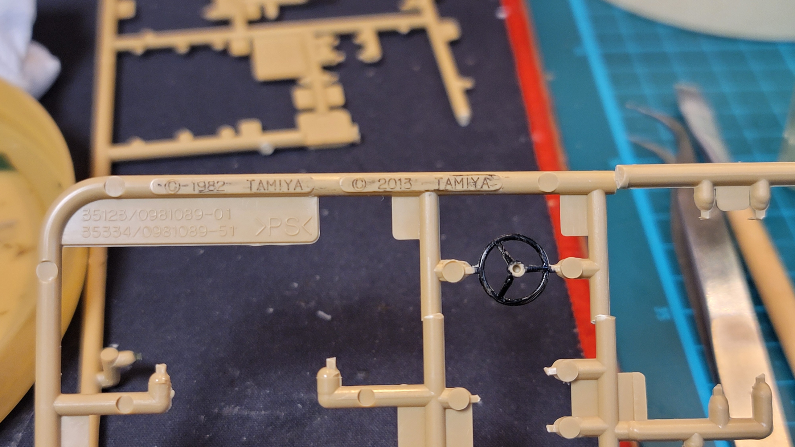 런너 한 켠을 보니 원 제조년도인 1982년이 새겨져 있고, 아마도 런너를 리비전한 것으로 보이는 2013년도의 각인이 하나 더 자리잡고 있다. 다른 밀리터리 프라모델들에 비해 타미야의 사출품질은 밀리터리계의 반다이라고 할 수 있겠는데, 아무래도 만들어진 년도가 오래된 것일까 부품과 게이트 표면이 좀 거친 감이 없지 않고, 특히나 요즘의 타미야+아카데미까지 포함해도 파트에 밀핀자국이 너무 많다. 설마 조립단차가 있지 않을까 걱정하면서 부품을 하나하나 떼어 봄.