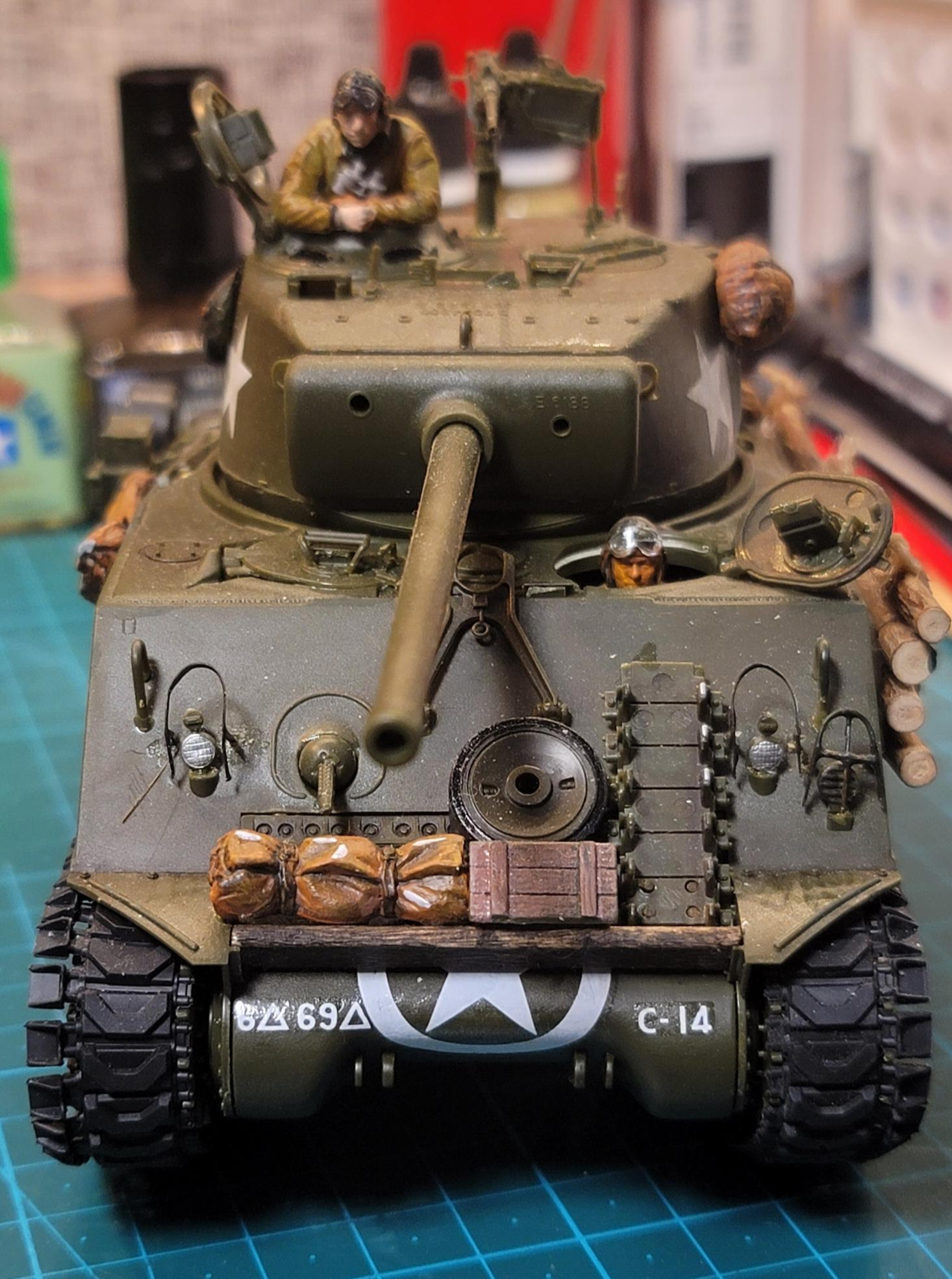 미군 소프트스킨 차량 조립할 때도 마찬가지인데 2차대전 미군 차량들은 차체 겉에다가 대중없이 뭘 쌓아놓는 것이 국룰이고 가장 어울리는 듯. 특히나 키가 껑충하고 앞뒤옆이 두부자른 것 같은 모양의 셔먼 차체는 밋밋함을 좀 죽이려면 악세사리를 구해다 쌓는게 정석인 듯. 변속기 커버가 되는 전면부쪽도 '증가장갑' 개념으로 예비 트랙이나 아이들러 휠, 배낭 등을 쌓아놓고 다니는 차량이 꽤 많이 작례로 보여서, 앞펜더 사이에 굴러다니던 아이스바 나무 스틱을 잘라다가 웨더링 칼라에 절여준 후 선반같이 붙이고 그 위에 이것저것 올려 주었더니 전면의 밋밋함이 사라졌다.