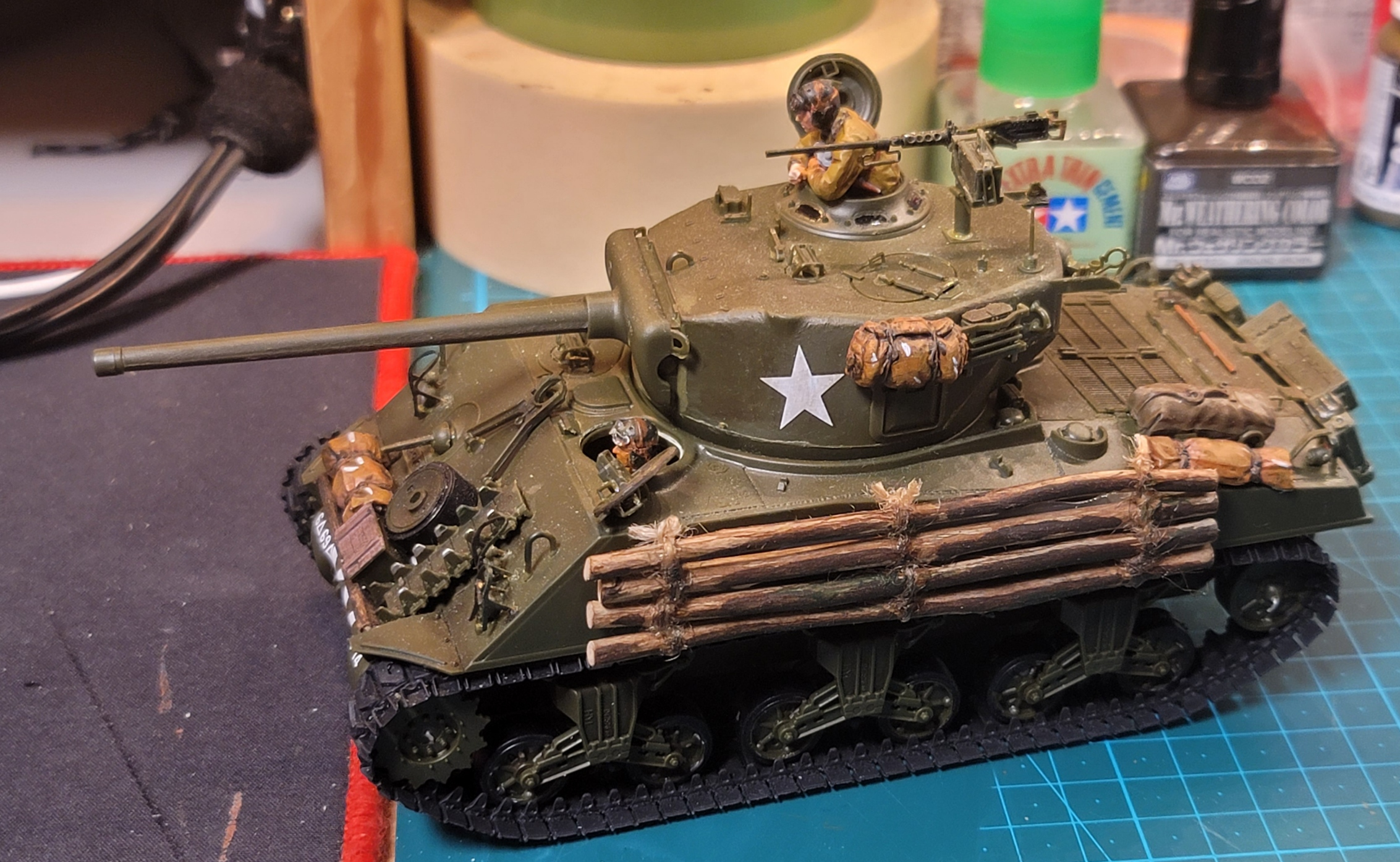 여기에 타미야의 전차병인형세트를 하나 구해다가 반신모형인 장전수를 차장으로 개조 후에 커맨더 자리에 앉혀주고, 상반신만 있는 운전병도 해치 따주고 안에 앉혀 보았다. 캔버스류의 액새서리 역시 키트에 부속된 것 뿐만 아니라, 타미야제 드럼/제리캔/군장세트에 있는 것들을 추가해 주었고, 왼쪽에는 진창길 극복 차원에서 늘어놓았을 것으로 추정되는 통나무들을 굴러다니는 미술재료에서 구해다가 노끈과 같이 묶어주고 글루건으로 고정함. 인형과 액세서리들은 모두 서페이서 처리 후에 일반 미술용 아크릴 물감으로 채색 해 주었다.