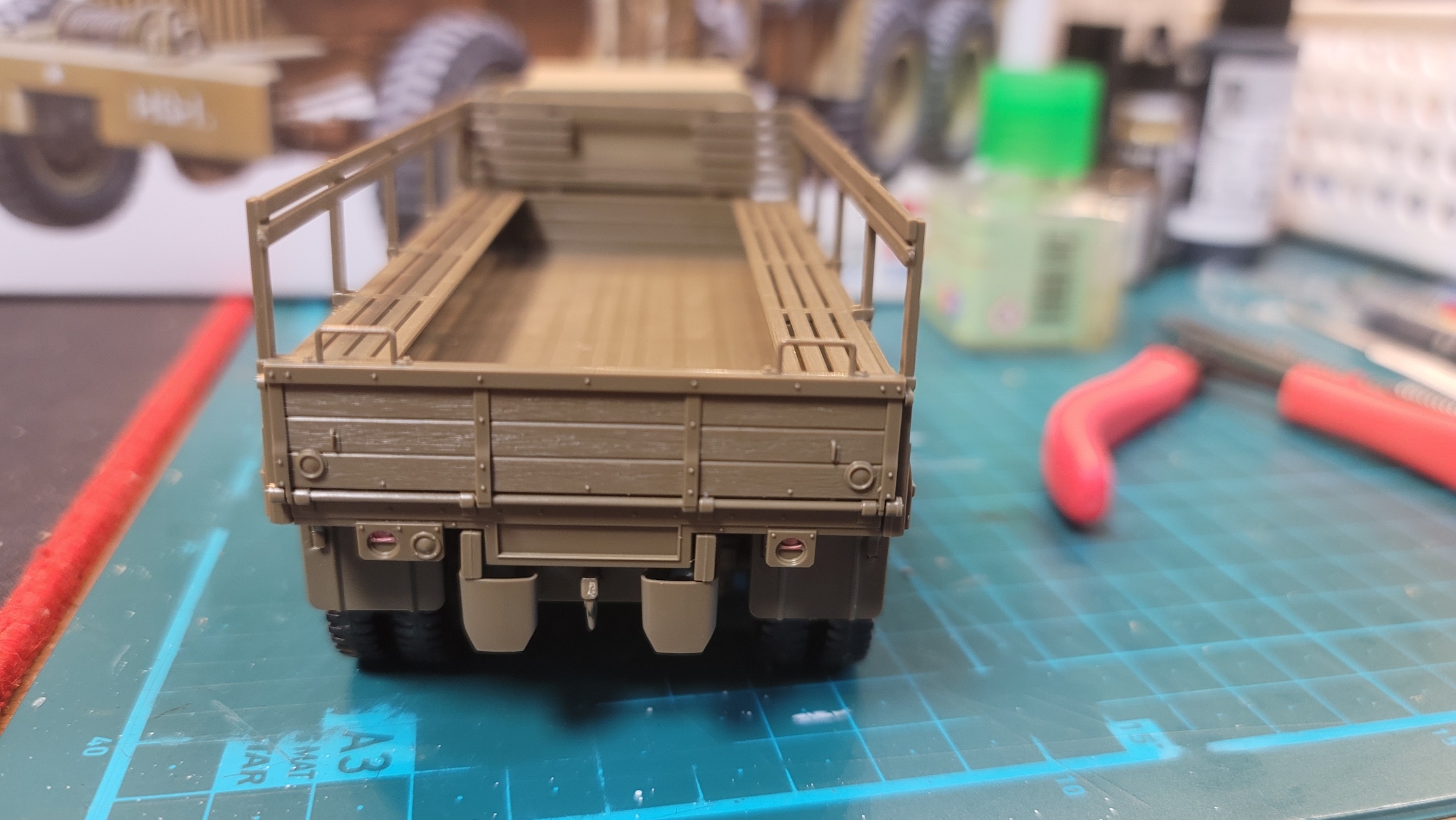 후면. 뒷등이나 재귀반사판 도색은 아직 안했고, 이 키트는 뒷적재함 문을 열거나 닫을 수 있다. 또한 병력이 앉을 수 있는 벤치형의 판을 내리거나 세우거나를 선택 조립할 수 있는데, 일단은 병력을 태울 수 있도록 벤치를 내려 조립함. 재주만 있으면 캔버스 갈빗살 조립하고 반호루를 쳐 주면 좋겠는데... 그렇게 조립할 리는 없겠지요.
