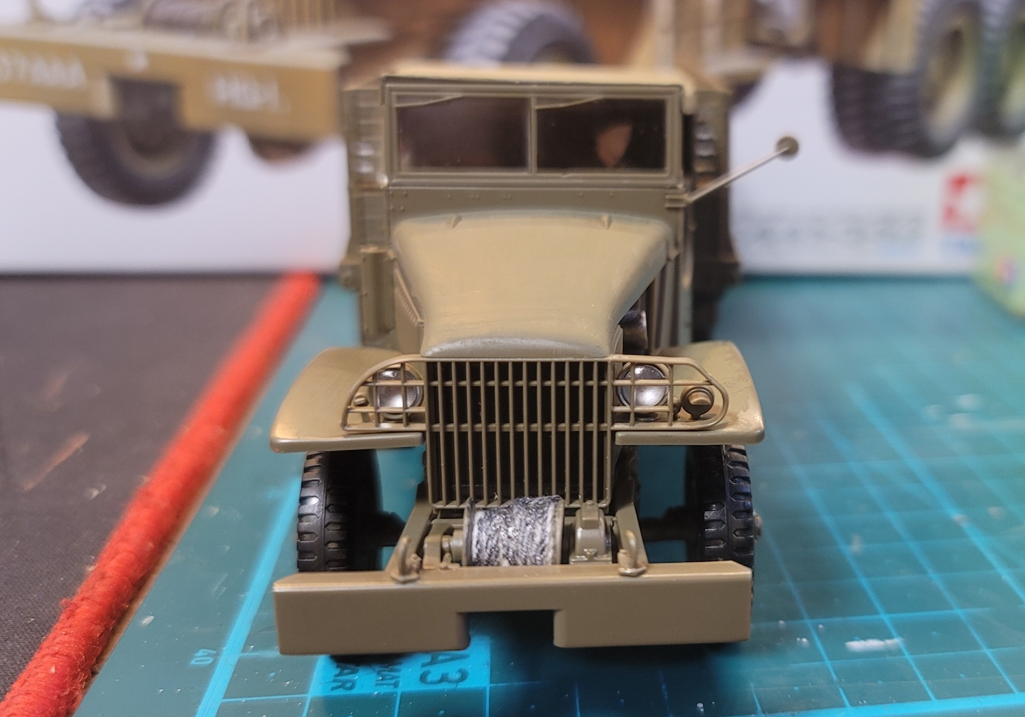 전면. 윈치가 있는/없는 사양을 선택 조립할 수 있는데 역시 추억의 제무시 모두 윈치와 거기에 연결된 쇠사슬이 범퍼에 주렁주렁 매달려있었던지라 윈치사양을 선택함. 높이가 다를 뿐, 앞서 조립했던 즈베즈다제 WC-52와 형상이 거의 같다. 차체가 크다보니 얼굴의 밀도가 좀 더 넓은것 뿐. 이렇게 2차대전 미군 차량들은 플랫폼은 단순화, 거기에 따르는 파생차종은 다양화되어 있어 같은 차대에 이런저런 다양한 기능과 임무를 부여한 것이 재미있다. 원래 차가 그런지 전면부의 디테일이 별로 없어보이기도 하다.