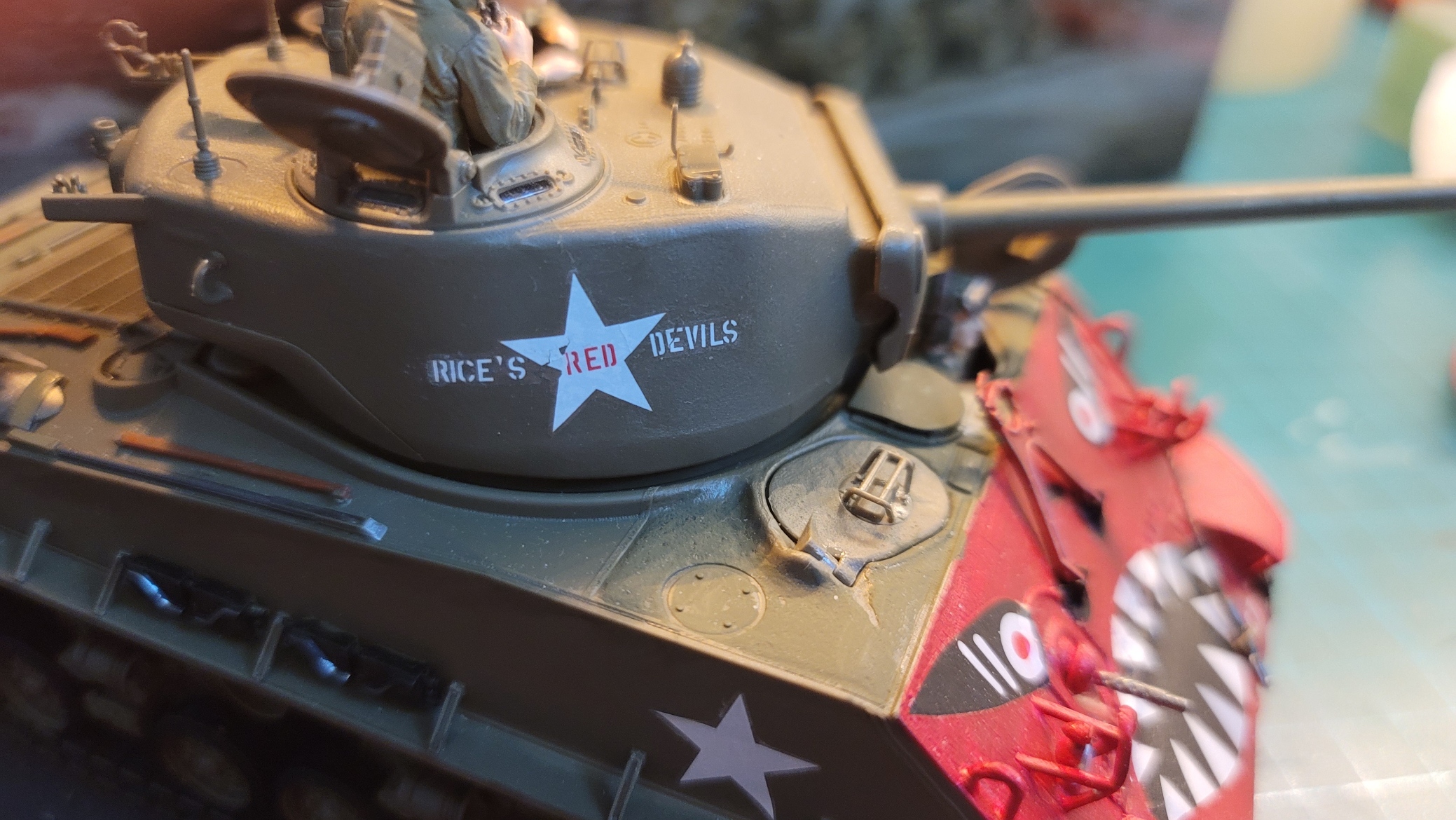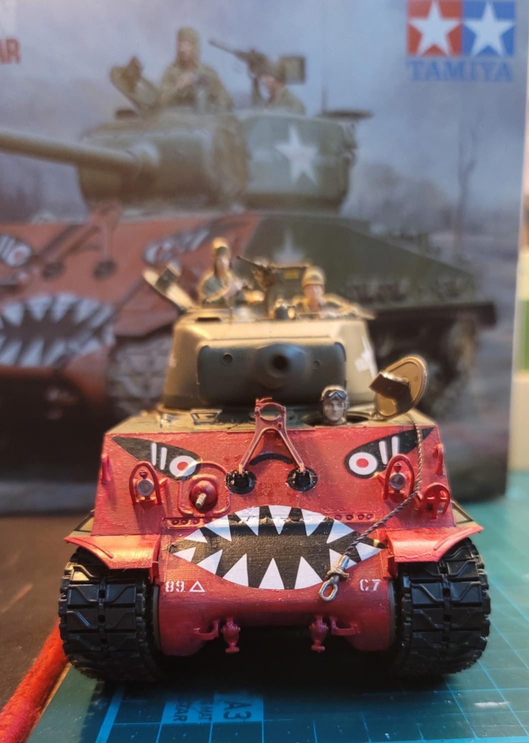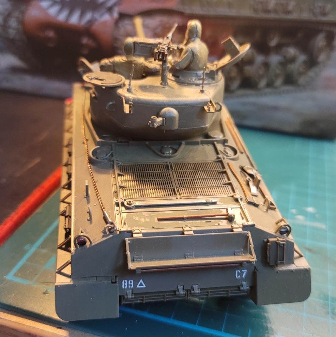 역시나 바예호 프라이머로 1차 붓도색, 이후 아크릴 물감으로 올리브드랍을 대부분의 차체에 부분도색하였고, 전면 red face는 미술용 아크릴 물감을 적절히 조색하여 정리했다. 명불허전의 타미야키트니 역시 조립에는 큰 스트레스가 없었고 시간도 그리 많이 걸리지 않았다. 이지에잇 셔먼의 특징인 새로운 현가장치 (HVSS)와 이에 맞게 확장된 측면 펜더와 궤도, 그리고 개량된 머즐브레이크가 포함된 76mm 주포가 이 차량의 특징이다. 아마도 '퓨리'영화를 통해 이지에잇 셔먼은 꽤 널리 알려져 있는 듯. 앞서 조립했던 아카데미 M4A3(76) 과 달리 이 차량은 전면 리퍼도장이 크게 부각된지라, 키트에 포함된 부품 외에 별도의 별물은 따로 달아주지 않았다. 고증을 무시하고 포방패와 포탑 사이를 채우는 캔버스 부품 또한 달아주지 않았는데, 이걸 달아두면 포탑 상하 가동 기믹이 없어지기 때문이다.