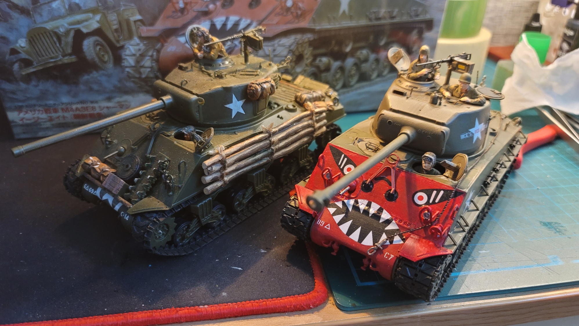 앞서 조립한 벌지전투 사양의 아카데미 M4A3와의 비교. 좌측의 것은 도색을 최소화하고 웨더링액을 사용해서 톤다운, 별물 부착을 중점으로 하였고, 오른쪽은 앞서 이야기했던대로 전면 도색을 부각할 목적으로 별물을 지양한 것이다. 여러 사정으로 인해 같은 플랫폼에서도 다양한 옵션이 존재하는 것을 이해하고 즐기는 것이 M4 셔먼 차량을 즐기는 방법 중 하나라고 한다. 한국전쟁에 사용했던 역사적 차량을 재현한 킷을 제작한 것만으로도 그 배경과 디테일을 이해할 수 있는 좋은 학습도구가 아닌가 한다.