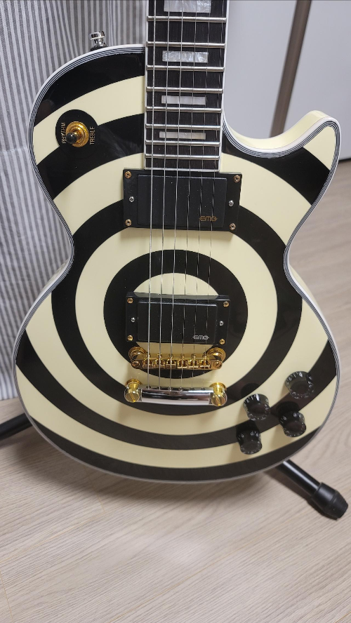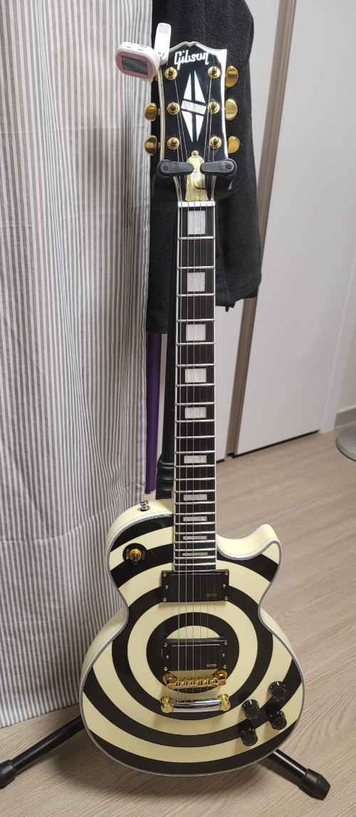 모델 선정 기준은 1) 2025년 현재 깁슨의 라인업에서 단종되었고, 앞으로 리이슈도 희박한 모델, 2) 지금 보유한 기타와 성격이 다른 것 이 두가지였고, 그렇게 최종 선택한 것이 깁슨 레스폴 커스텀, 잭 와일드 시그네쳐 불스아이 모델 되시겠다. 커스텀 헤드의 다이아몬드 펄로이드 로고는 깁슨 매니아들의 가슴을 설레게 하는 무언가가 있으니까, 기왕이면 커스텀으로. 여기에 일반적인 레스폴 모델과는 차별점이 있는, 나무결이 훤히 드러난 메이플 넥, EMG 픽업, 화려한 바디 페인팅 등의 특징적인 사양의 '사나이' 기타라 관심이 생겼다.