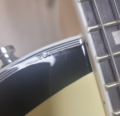 - 바인딩 상태는 아래와 같이 보시는대로 극악. 바인딩의 두께가 틀어진다거나 간격이 균일하지 않은 문제는 칩슨의 공통적인 문제로 널리 보고되어 있으니 차치하고, 바인딩 일부는 상도가 제대로 먹지 않아 표면이 노출, 표면이 까끌까끌하거나, 바인딩 끝이 직각이라 살이 긁히거나, 목재와 바인딩 사이 단차가 제대로 수정되지 않고 그냥 상도가 올라가 경계면에서 도장이 푹 꺼지는 등 그냥 별로다. 이런것에 민감한 사람들은 절대 칩슨은 장난이라도 사지 않았으면 좋겠다. 바인딩 없는 모델이나 칩슨 말고 다른 종류의 기타를 알아 보시던가.