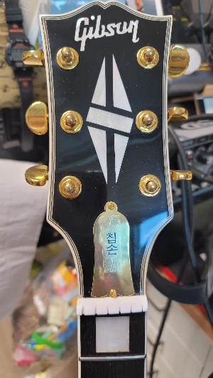 - 위 사진에서 보시듯, 깁슨 오픈북 헤드는 뭐 그럴싸 하다. 깁슨 로고도, 커스텀 다이아몬드 로고도 모두 자개무늬의 펄로이드로 잘 박혀 있다. 몇 년 전 이런저런 커뮤니티에서 포스팅된 '깁슨 진품과 칩슨의 차이점' 같은 것 보다는 기대 이상으로 진품 흉내를 많이 내긴 했는데... 여전히 넥과 트러스로드가 연결되는 너트쪽의 잘록한 목이 진품보다 좀 길고, 깁슨 로고가 에피폰과 비슷한 각도로 약간 비스듬히 뉘어져 있다. 원래 G와 N 의 아래로 길게 뻗은 끝단이 헤드와 수직한 방향으로 평형을 대부분 이루는게 진품의 로고 방식이다 - 보유한 스탠다드로 비교해서 확인 완료.
