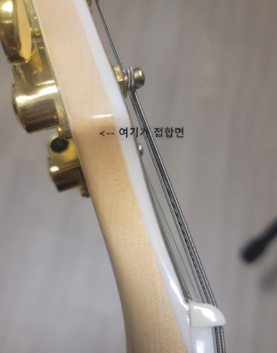 - 내가 아는 한 깁슨의 넥은 헤드의 사이드 부분을 접붙이는 것 외에 전체 기둥은 1피스 통넥으로 알고 있는데, 이 녀석은 헤드가 꺾인 높이만큼 각목 두 개를 쌓고 접합한 후 깎은 것 같다. 아래 사진에서 보시는 대로 1번, 6번 페그가 있는 쪽 측면으로 비스듬하게, 셋인 넥 부풀어 오르는 지점에서 넥과 수평한 방향으로 제 2의 나무를 덧댄 흔적이 보인다. 페인트로 덮어버리는 커스텀 모델이라면 인식조차 할 수 없을텐데, 나무 재질이 투명 글로스 바니시로 노출된 모델이라 쉽게 알 수 있었던 부분. 뭐 헤드가 꺾이는 레스폴 모델 특성상, 진품 수준으로 받아먹을 것 아니면 굳이 원피스 넥을 고집 할 필요는 없으니 좋았쓰.