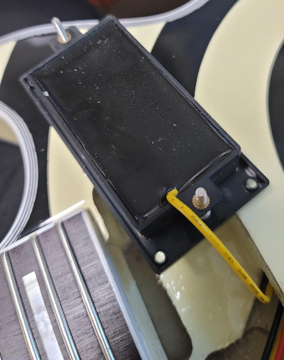 - '나 EMG일지도?' 라고 우기는 픽업을 한 번 까 봤는데, 당연히 액티브는 아니고 뒷판 로고도 없으며, 보시는대로 얇고 화려한 노란색 전선 하나로 결선되어 있지만, 그래도 나름 수지로 픽업하부를 잘 실링 해 놓았다. 외부 공연에 쓸 목적이 아닌지라 진정한 쓰레기 픽업인지 영영 알 길은 없을 것 같지만, 집에 세팅해 놓은 앰프-이펙터 환경에서는 볼륨이 딸린다거나, 드라이브가 잘 안먹는다던가 하는 문제는 없지만 이펙터나 앰프 EQ를 돌려봐도 뭔가 레스폴의 앵앵거림과 다른 흐리멍텅함이 느껴진다. 더군다나 EMG 라면 생톤에서도 뚜렷한 음감이어야 하는데, 여느 PAF 픽업보다 더 음이 퍼져 나간다. 일단 좀 더 쓰다가 돈이 좀 모이면 테슬라 픽업 정도를 가성비 있는 교체 후보군으로 생각 중이다. 그 때 2V 2T의 배선도 바꾸어야 할 지도.