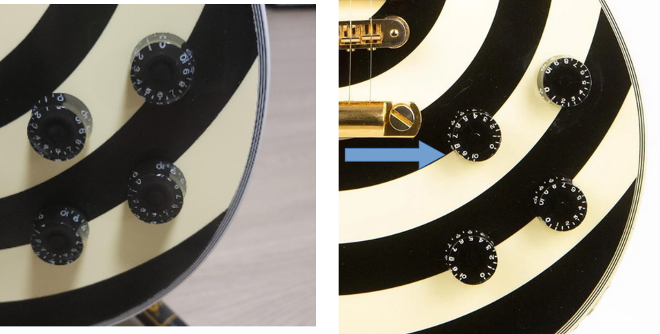 (좌) 이번 구입한 칩손, (우) 구글링한 진품 깁슨 커스텀. 노브 간격이 확실히 다르다.