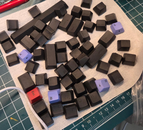 그냥 겉만 정리해 주고 다시 봉인할까 하다가, 이렇게 대충 겉핥기로 정리 해 두면 나중에 사용해야 할 때 문제가 될 것 같아서, 결국 키캡을 다 분리해서 본체는 다량의 물티슈로 세월의 흔적을 제거, 키캡은 갖고있던 초음파 세척기에 넣고 수차례 돌려준 끝에 큰 어려움 들이지 않고 캡 세척을 완료하였다.